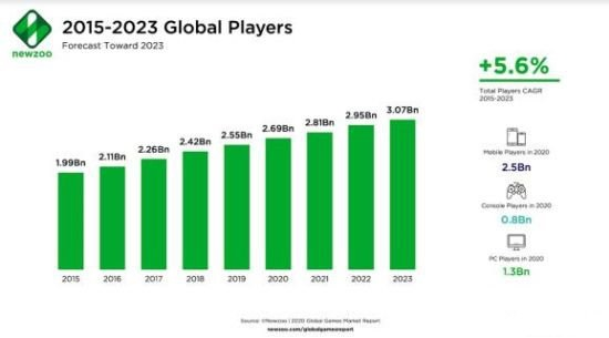 Newzoo 称,2020 年预计全球游戏市场收入为 1593 亿美元,2023 年这一数字将超过 2000 亿美元。到今年年底,全球玩家数将达到 27 亿人,其中移动设备玩家为 25 亿人,PC 玩家为 13 亿人,游戏主机玩家 8 亿人,这是由于有些游戏玩家不止在一个设备上游玩游戏。