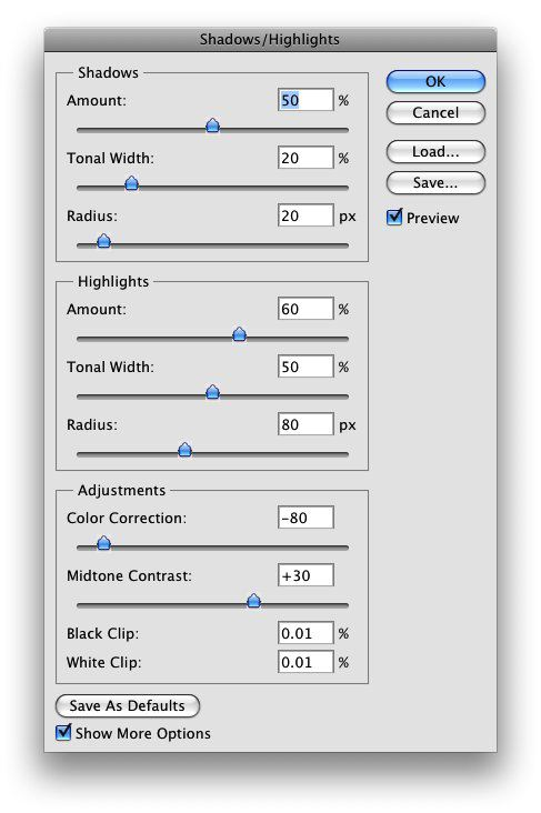这里需要用到cs版本以上的功能,ps7没有这个功能,全部合并图层,然后选择 图层-智能对象-转化为智能对象;继续,选择 图像-调整-阴影和高光,按下图的设置调整,也可以根据自己的感觉设置。