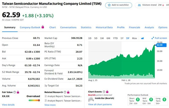 如图所示,台积电 (NYSE:TSM)上涨 3.10% 至 62.59 美元,创下收盘新高。台积电总市值约 3245.97 亿美元。