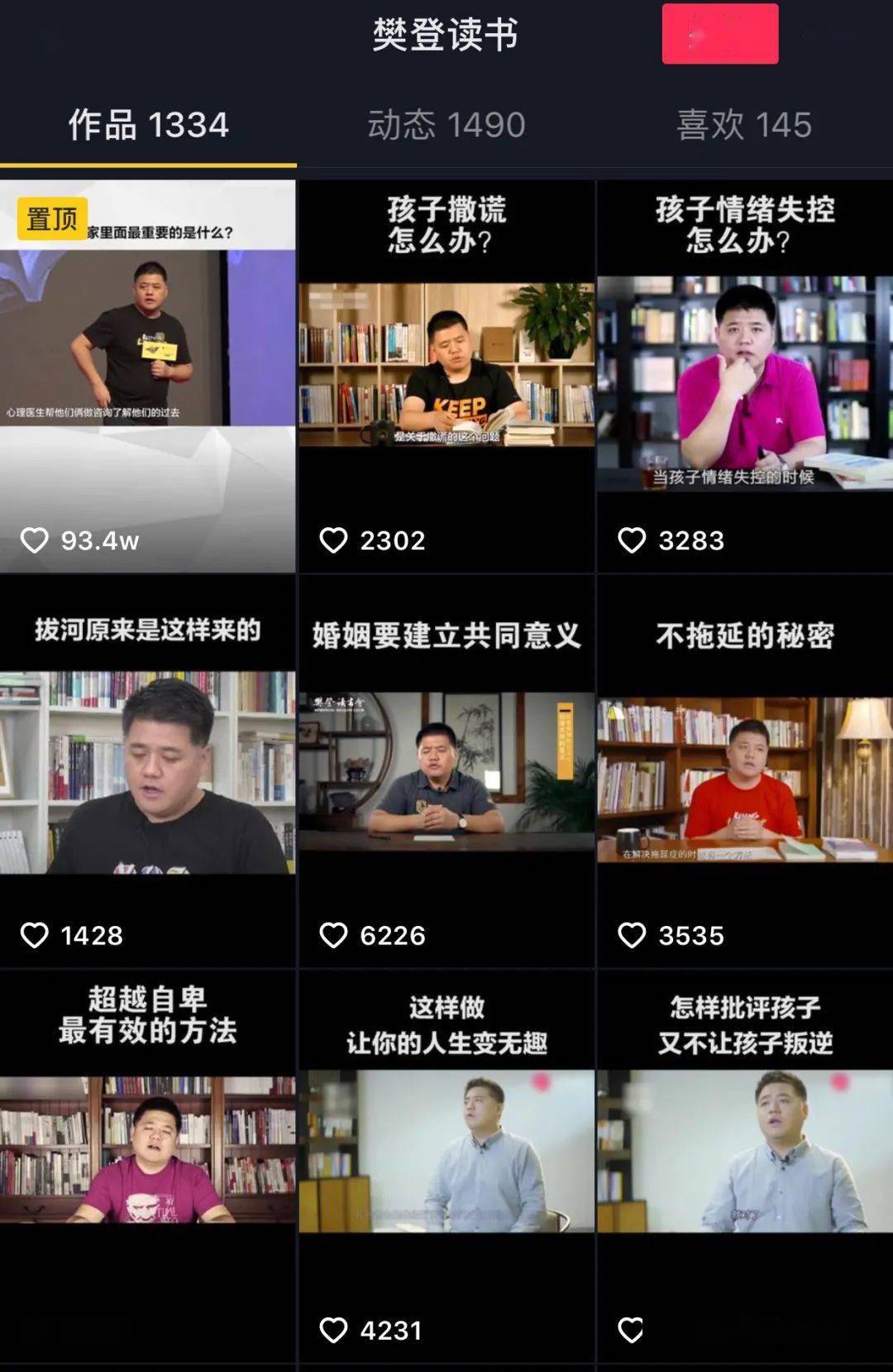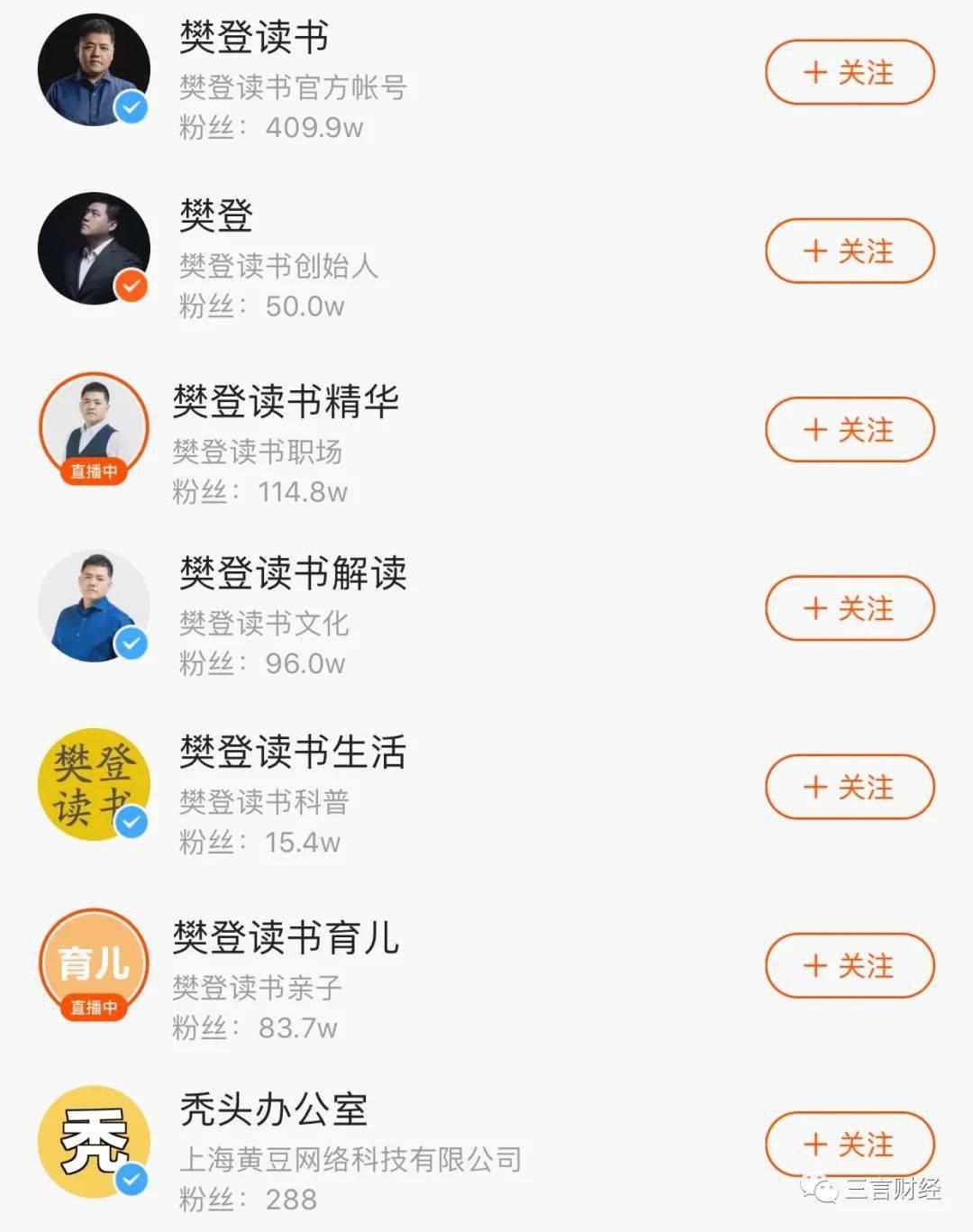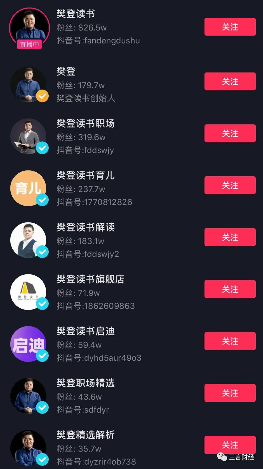 三言财经注意到,和樊登以及樊登读书有关的并且经过平台认证的短视频账号超过20余个。内容涉及、读书、职场、育儿等多个方面,种类繁多。此外,这些账号粉丝量也十分巨大,有账号粉丝量高达826.5万,粉丝量最低的也有近十万。