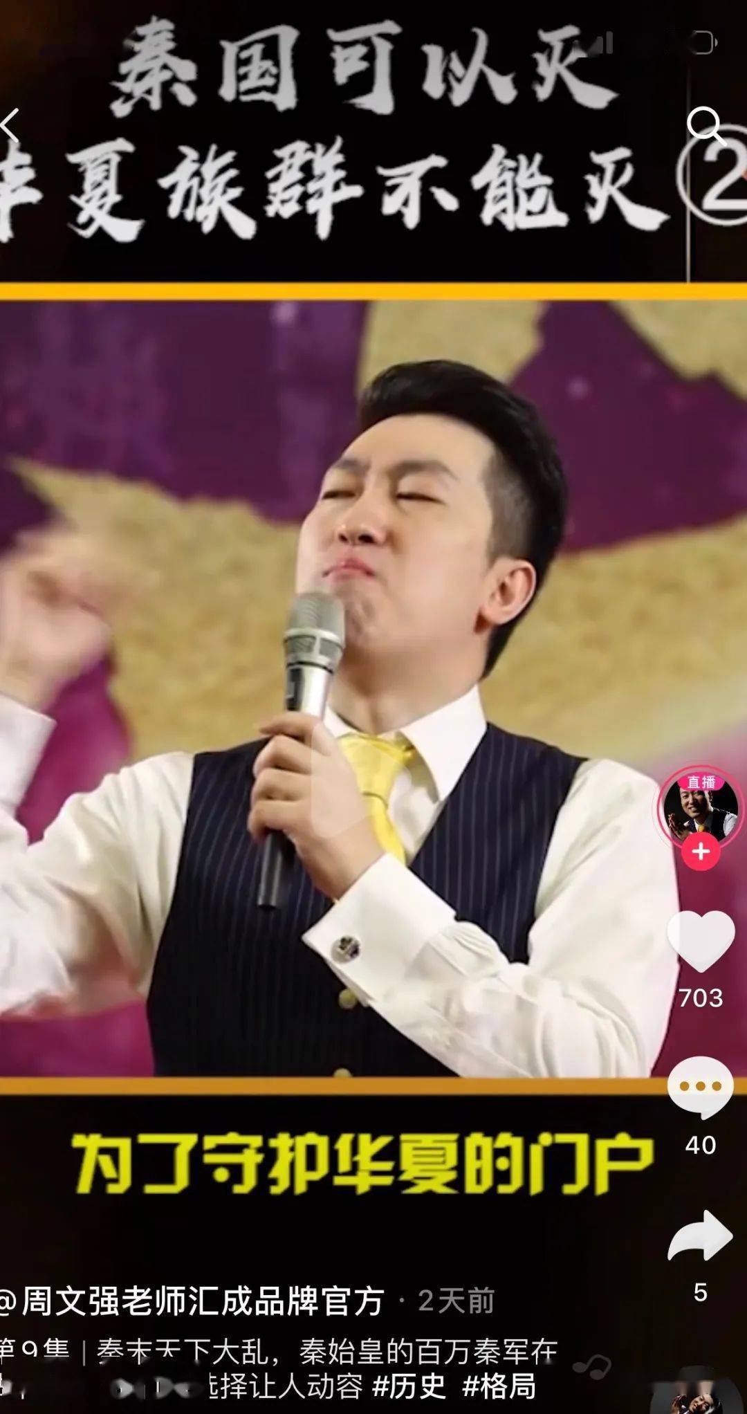 经常玩短视频的网友说不定刷到过周文强的演讲视频,他经常吐着唾沫星子讲秦始皇多么伟大。