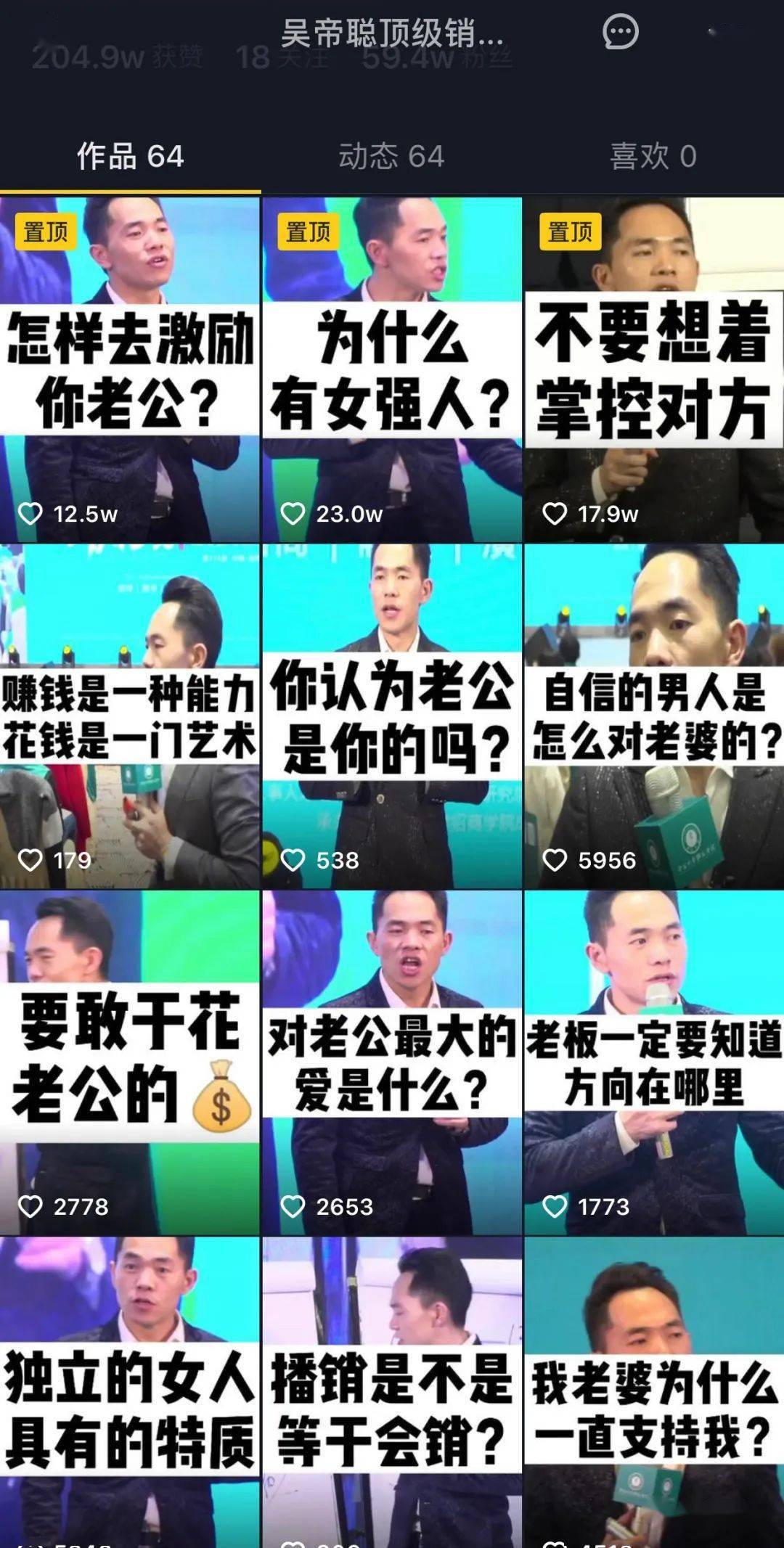 其中粉丝量最大的账号“吴帝聪顶级销讲”中,近期视频内容主要以夫妻关系、企业运营为主。而且几个账号则以销售方式类以及吴帝聪个人生活类短视频为主。