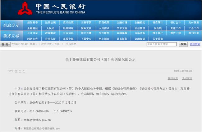 12月4日,央行网站更新显示,受理了朴道征信有限公司(筹)的个人征信业务申请。
