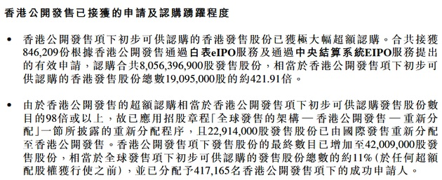与此同时,京东健康公告称,国际发售项下初步提呈发售的发售股份已获大幅超额认购,相当于国际发售项下初步可供认购发售股份总数的约 31.1 倍。分配至国际发售项下承配人的发售股份最终数目为 339,891,000 股,相当于全球发售项下初步可供认购发售股份总数的约 89%(于任何超额配股权获行使之前)。国际发售已获超额分配 57,285,000 股发售股份,且国际发售项下共有 663 名承配人。