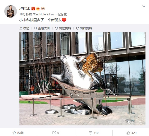 14 日消息 今天下午,小米集团副总裁,中国区总裁,红米 Redmi 品牌总经理卢伟冰微博表示,小米科技园多了一个新朋友。图片显示这是一只飞猪造型的雕塑