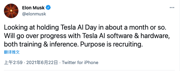 马斯克:特斯拉将在一个月内举办AI日 旨在招聘