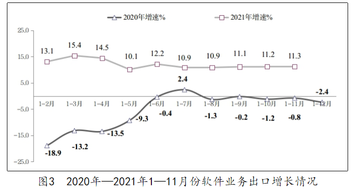 软件业务出口小幅增长。1—11 月份,软件业务出口 462 亿美元,同比增长 11.3%,比 1—10 月份提高 0.1 个百分点,近两年复合增长率为 5.1%。其中,软件外包服务出口 128 亿美元,同比增长 19.9%,嵌入式系统软件出口 177 亿美元,同比增长 3.7%。