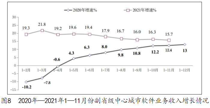 利润总额保持增长。1—11 月份,软件业利润总额 10153 亿元,同比增长 8.2%,比 1—10 月份回落 0.9 个百分点,近两年复合增长率为 7.6%。
