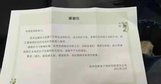 一张感谢信图片显示,感谢信中提到,“亲爱的宸帆家人…… 感谢在公司特殊时期,依然坚持做好本职工作,并陪伴我们一路前行的你。真心祝福你能在未来的日子里继续发光发热,成就不平凡的事业。聚是一团火,散是满天星。感恩陪伴,我们期待未来再次相逢。”感谢信署名为杭州宸帆电子商务有限责任公司。