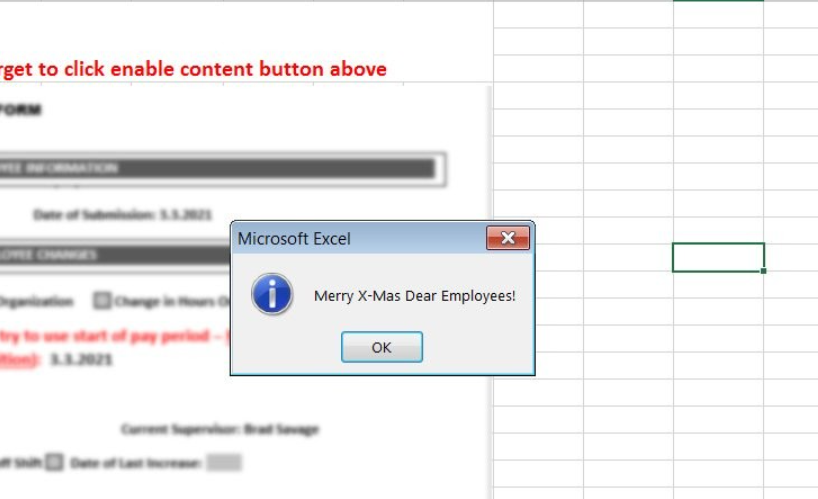 Excel 会要求受害者启用内容,并弹出“圣诞快乐”的消息。当然,这只是危险的第一步。
