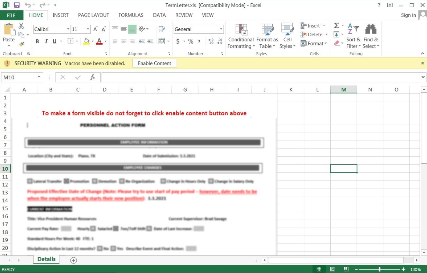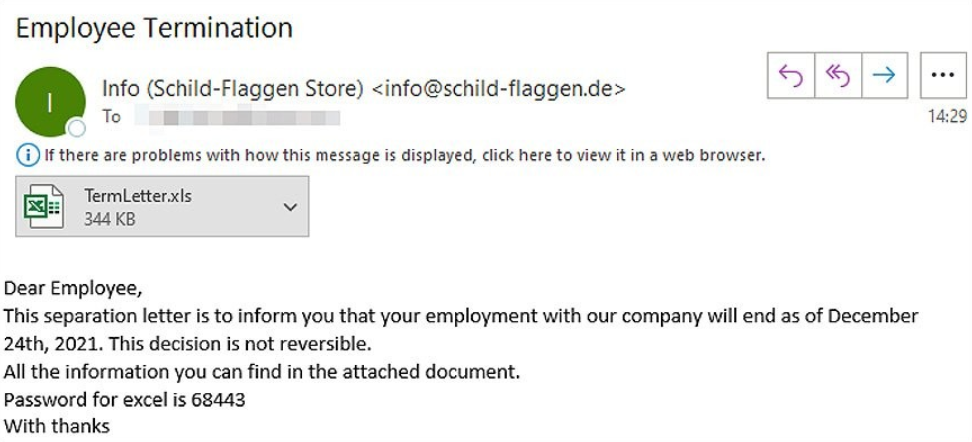 这种网络钓鱼攻击是由安全研究员和 Twitter 用户 @ffforward 发现的,如下图所示,邮件中包含一个名为“TermLetter”的附加 Excel 文件,可能是 Termination Letter 的缩写。