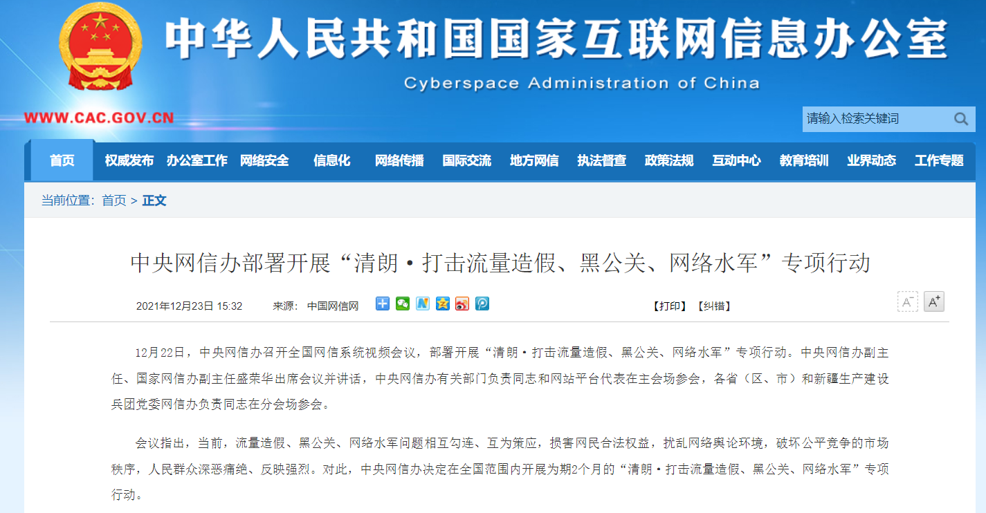 中央网信办部署开展“清朗?打击流量造假、黑公关、网络水军”专项行动