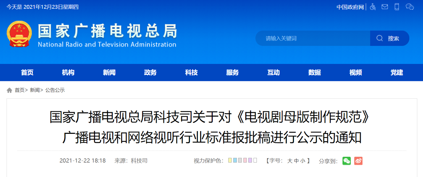 23 日消息,12 月 22 日,国家广播电视总局在官网公示《电视剧母版制作规范》广播电视和网络视听行业标准报批稿。