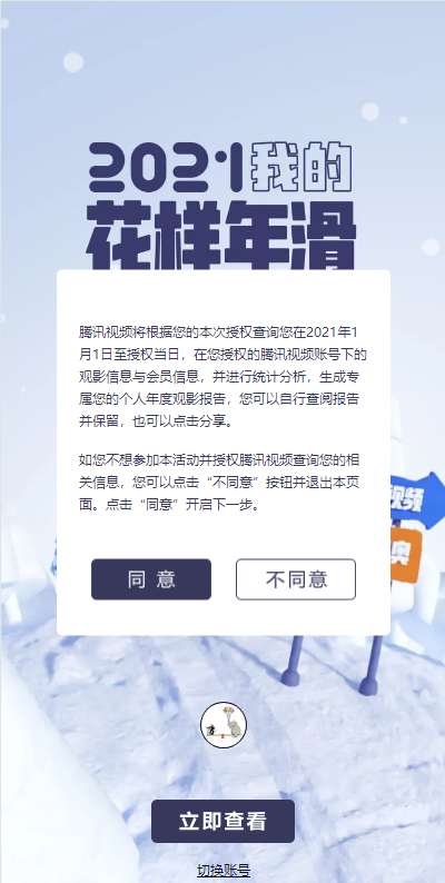 腾讯视频将根据您的本次授权查询您在 2021 年 1 月 1 日至授权当日,在您授权的腾讯视频账号下的观影信息与会员信息,并进行统计分析,生成专属您的个人年度观影报告,您可以自行查阅报告并保留,也可以点击分享。