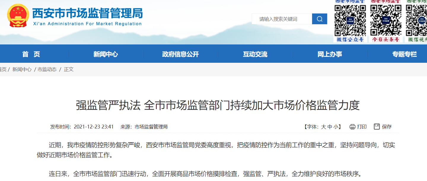 西安市市场监管局副局长吴繁在回答媒体提问时表示,已约谈规模较大的连锁商超、农产品批发市场主体 110 多户,京东、美团、盒马等 20 余家电商公司和连锁商超、医药企业网络销售平台,责令企业树立大局意识,平抑价格、加强配送,做好稳价保供工作。