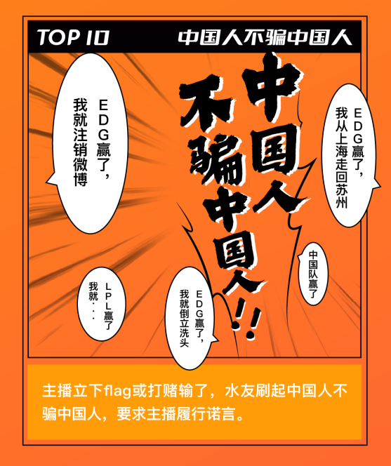 每当主播们立下 Flag 却输了后,水友们最强有力的“催收”方式就是在屏幕上疯狂刷起“中国人不骗中国人”的弹幕。一般面对这种情况,即便主播再想耍赖,也只能乖乖履约了。