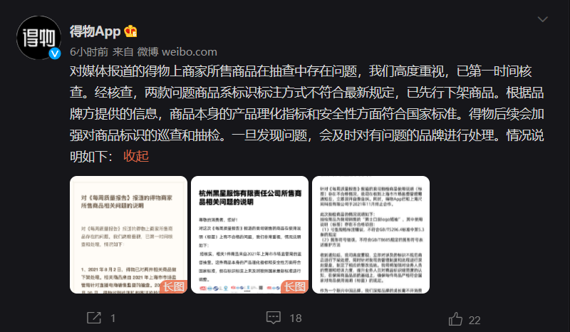 得物回应直播产品抽样不合格率 50%:商品标注方式不符合最新规定