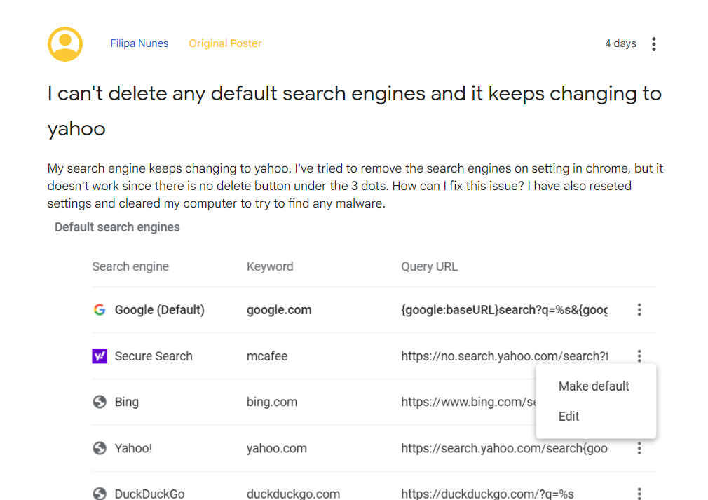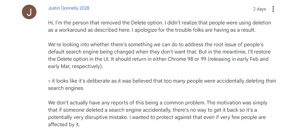 我为大家因此而遇到的麻烦表示歉意。我们正在研究是否可以采取一些措施,来解决人们不希望更改默认搜索引擎的根本问题。但与此同时,我将恢复 UI 中的删除选项。它应该在 Chrome 98 或 99 中返回(分别在 2 月初和 3 月初发布)。