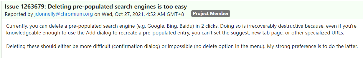 此前,用户只需点击 2 次即可删除预装的默认搜索引擎(例如 Google、Bing、Baidu)。这样做具有不可恢复的破坏性,因为即使用户有足够的知识,可以使用“添加”对话框重新创建搜索引擎,也无法设置建议、新标签页或其他专用 URL。