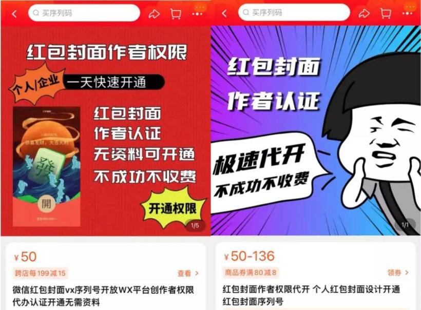 其次是资质认证、审核的环节,微信对于红包制作者有资质认证要求,企业要先申请公众号,之后还要提供一些认证材料。个人则需要申请开通视频号,并且要获得 100 个有效粉丝,于是商家们开始提供更“灰色”的服务,帮企业做红包认证通过审核,以及为个人视频号“刷粉”,或者直接帮代开权限。