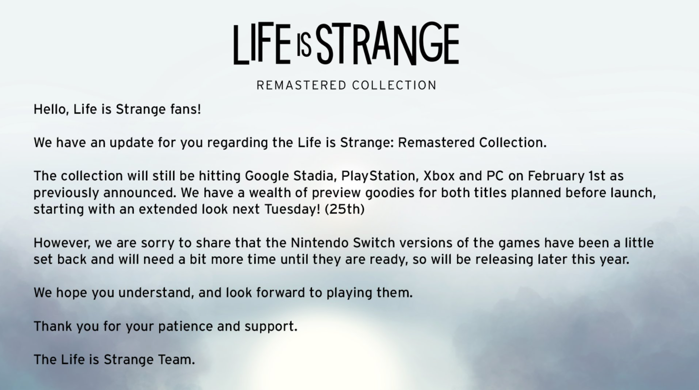 不过,《奇异人生重制版合集》官方宣布,游戏的 Switch 版本将推迟发售,无法与其他版本一同上线。