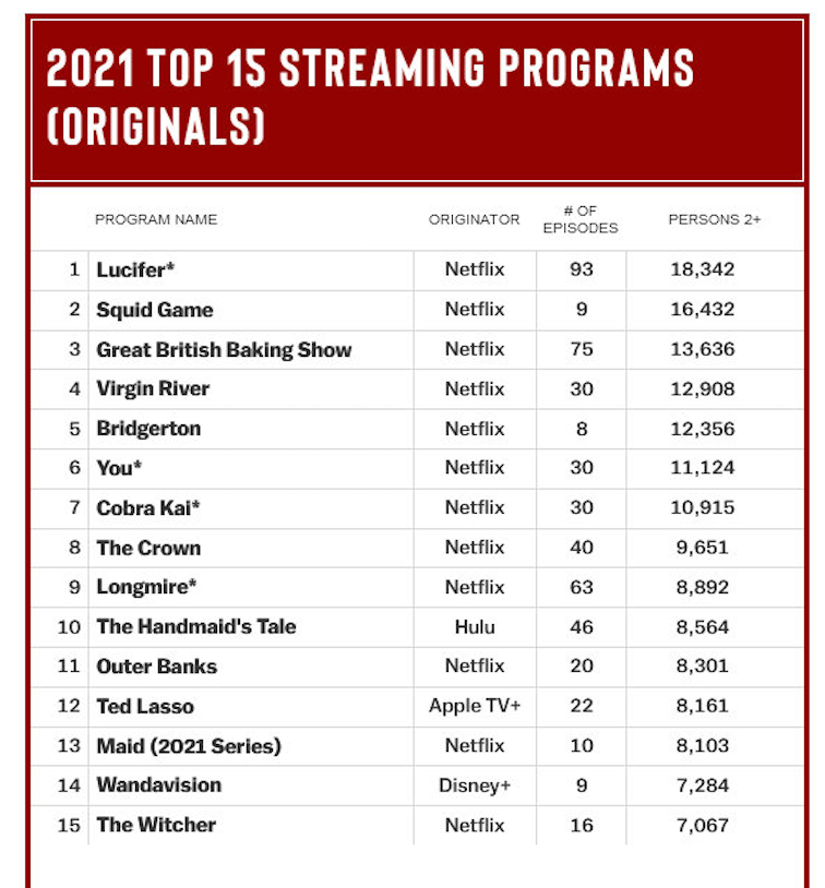 美国 2021 流媒体原创剧集播放量排行榜:《路西法》第一,《鱿鱼游戏》第二!