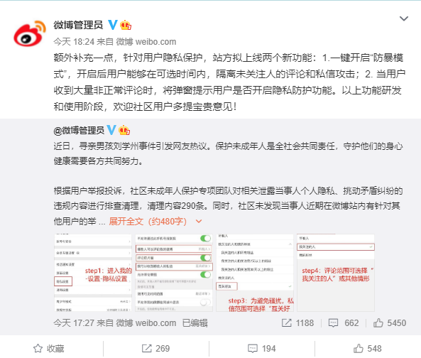 微博也特别提示大家,如遭遇私信或评论攻击骚扰,用户可依据自身需求选择开启隐私防护功能。也可以选择开启“评论防火墙”,系统将自动屏蔽疑似人身攻击和垃圾骚扰的评论内容。如果遇到恶意攻击的博文,可通过前台投诉入口 和 @微博管理员 形式进行举报,站方查实后,将及时处置。