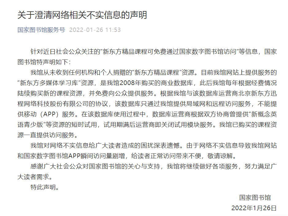 国家图书馆今日发布公告,针对近日社会公众关注的“新东方精品课程可免费通过国家数字图书馆访问”等信息,国家图书馆特声明如下: