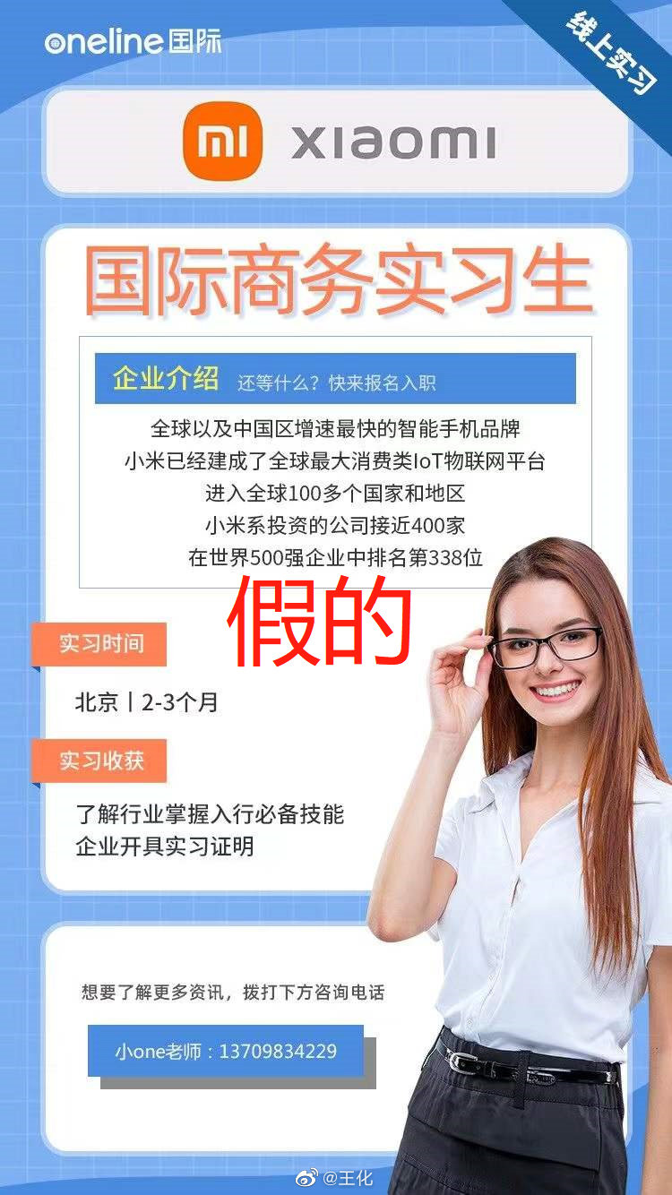 王化:小米没有线上实习岗位,更不会销售实习机会