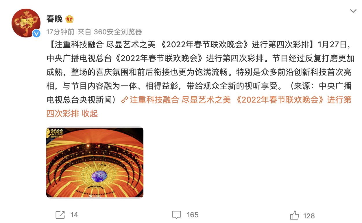 27 日消息,据春晚官方微博消息,1 月 27 日,中央广播电视总台《2022 年春节联欢晚会》进行第四次彩排,众多前沿创新科技首次亮相,与节目内容融为一体。