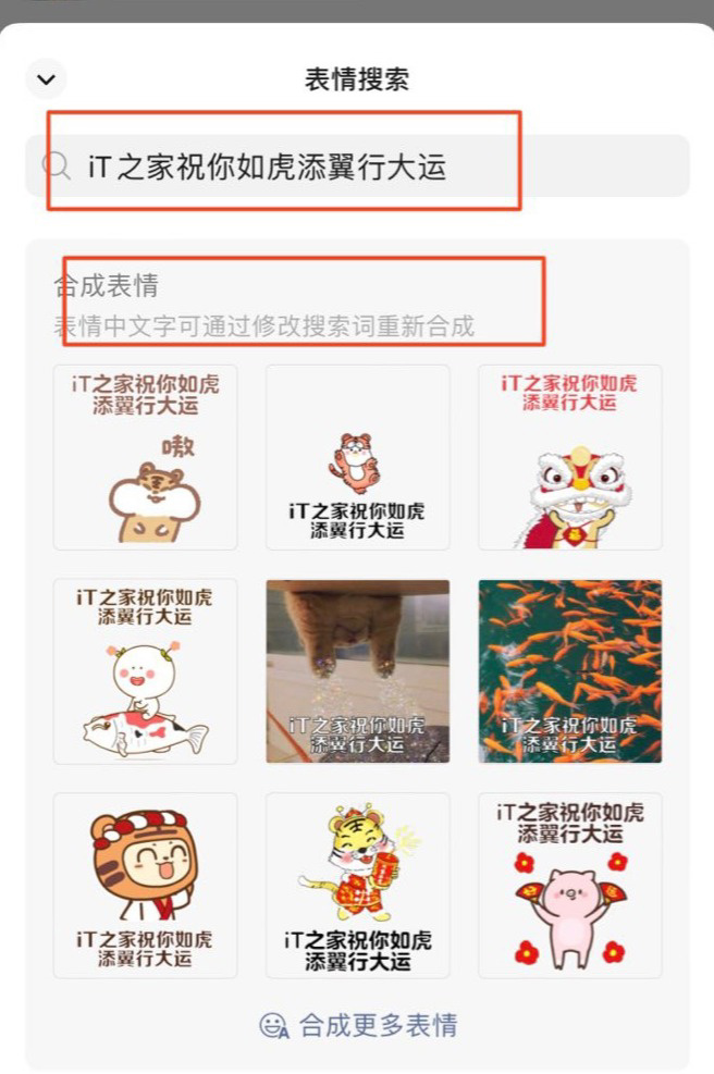 从图中可以看到,用户可以随意输入祝福语,然后进行表情搜索,就可以合成具有自定义祝福内容的表情包。