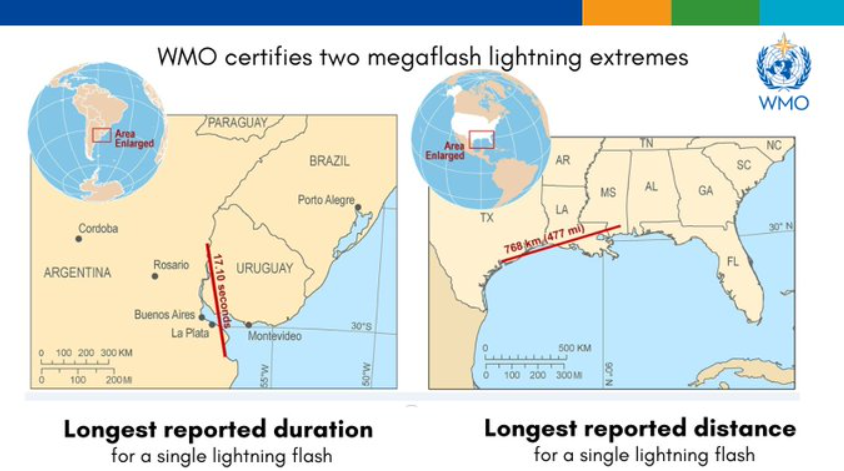 “这些都是来自单一闪电事件的非凡记录。极端环境是对自然力量的活生生的衡量,也是能够进行此类评估的科学进步。WMO 天气和气候极端事件报告员 Randall Cerveny 教授说,很可能仍然存在更大的极端事件,随着闪电探测技术的改进,我们将能够观察到它们。
