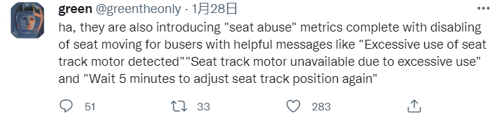 据报道,新的座椅将跟踪和衡量用户所做的调整量,如果他们检测到“过度”变化,将禁用控制。该功能首先由匿名黑客和研究人员 @greentheonly 确定,随后被 Jalopnik 报道。