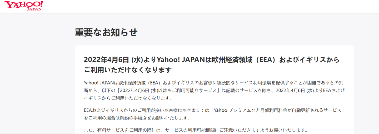 雅虎日本给定的原因是遵守欧洲法规的成本,其中包括 GDPR。雅虎日本在一份声明中表示,为欧洲经济区和英国的客户提供持续服务将很困难,并进一步告诉 IT Media,“不可能”满足合规成本并回应相关法律。