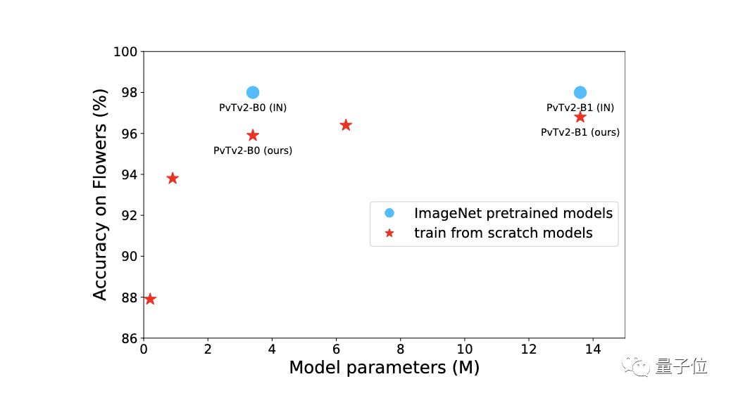 在上图中,很明显与从头开始训练相比,ImageNet 预训练的模型需要更多的参数和计算成本。