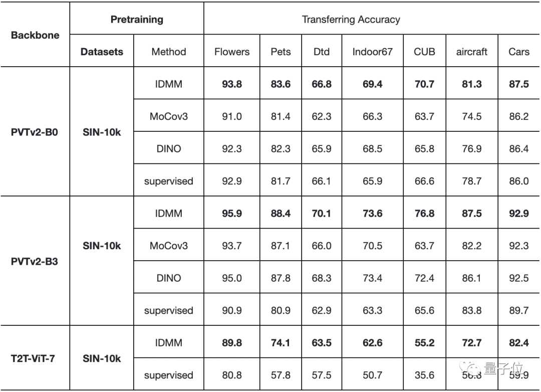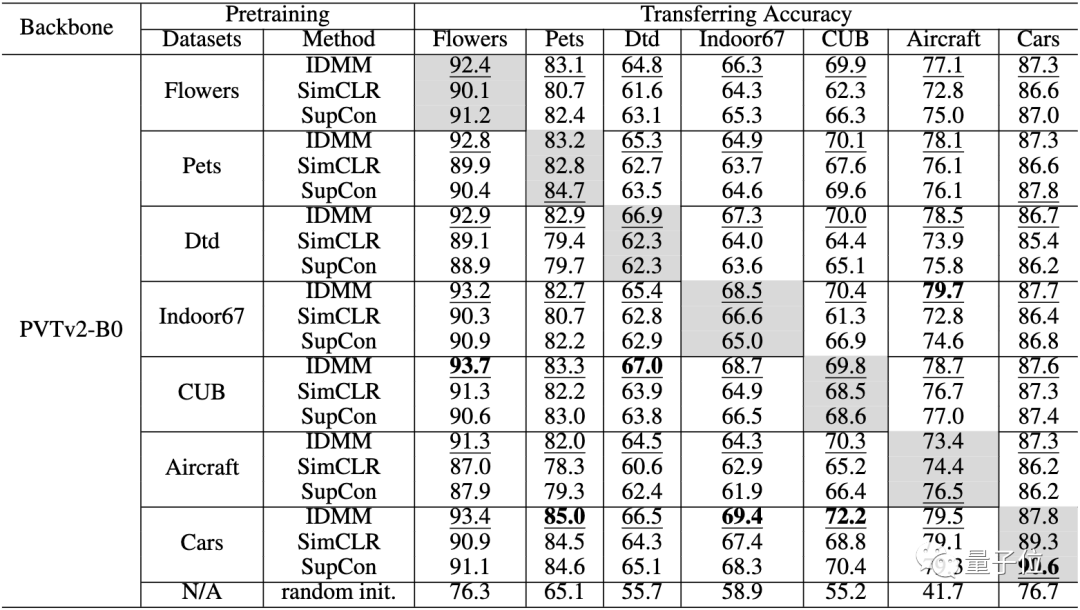 在小数据集上进行预训练时的迁移能力。每个单元格和列中精度最高的元素分别用下划线和粗体表示。最后,在下表中,作者评估了在不同数据集上预训练模型的迁移精度。对角线上的单元(灰色)是在同一数据集上进行预训练和微调。对角线外的单元格评估了这些小数据集的迁移性能。