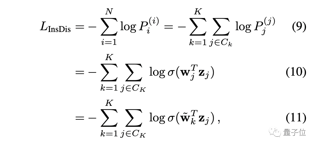 我们把 O 送入 Softmax 层,就得到一个概率分布 P???。对于实例判别,损失函数为: