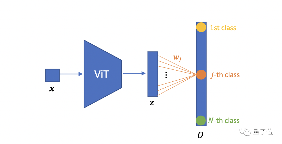 在这篇论文中,作者提出了用于自我监督 ViT 训练的 IDMM(Instance Discrimination with Multi-crop and CutMix)。我们先来看一下 ViT 图像分类网络的基本架构:将图像样本 x?(i = 1, 2, …, N; N 为图片数量)送入 ViT 中,得到一组输出表征 z?。w?为第 j 个分类的权重。
