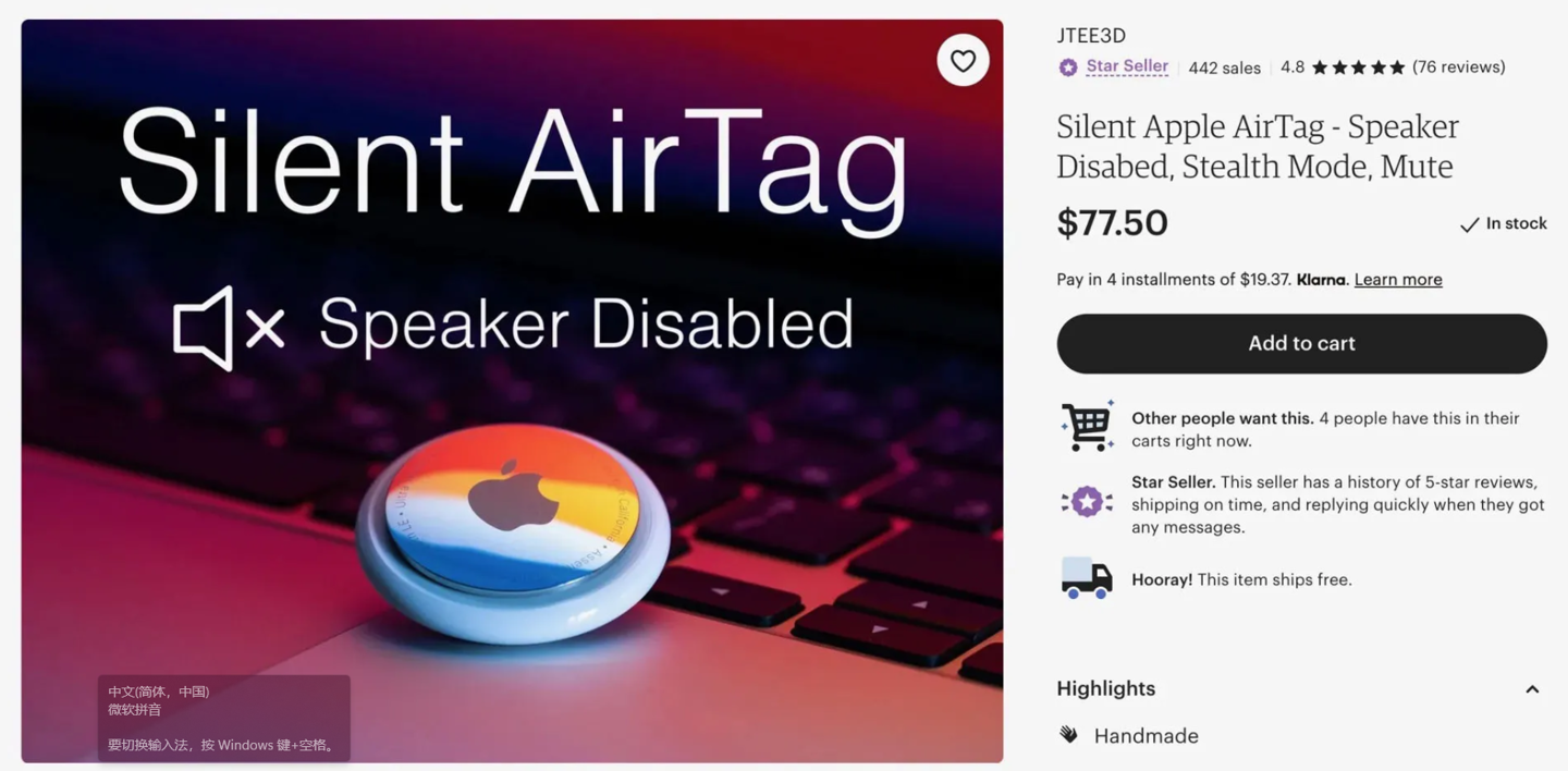 然而,据 9To5Mac 报道,在 eBay 和 Etsy 上发现了带有去掉蜂鸣器的 AirTags。一款名为“Silent AirTag”的产品以 77.50 美元的价格出售,看起来与普通的 29 美元的 AirTag 相同,但设备电池下方开了一个小孔,从而断开了蜂鸣器的连接。
