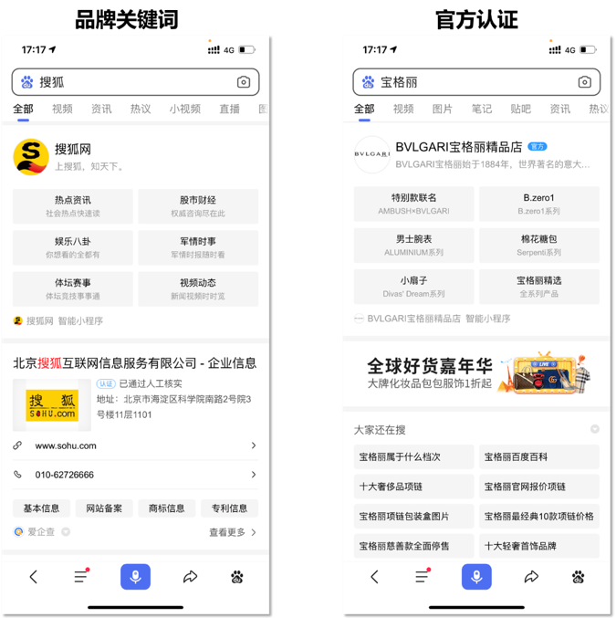 官方认证,是指既满足商标独有,也满足搜索场景下唯一性、准确性的小程序,可申请“官方”标识保护。品牌认证及直达效果如:
