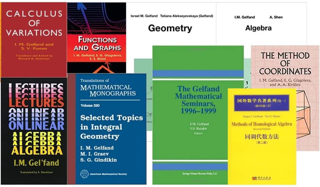 值得一提的是,或许是由于自己年轻时家贫失学的缘故,盖尔范德对中学生的数学教育特别关心。他是 1930 年代莫斯科数学奥林匹克竞赛的发起人之一,还参与设立了一所远程数学函授学校。他领头和几位数学家朋友一起为中学生编写了 5 本基础数学读物:《代数》《几何》《三角函数》《函数和图像》《坐标方法》,英文版在 2000 年代由 Springer 出版社出版,中译版收录在《盖尔范德中学生数学思维丛书》中。