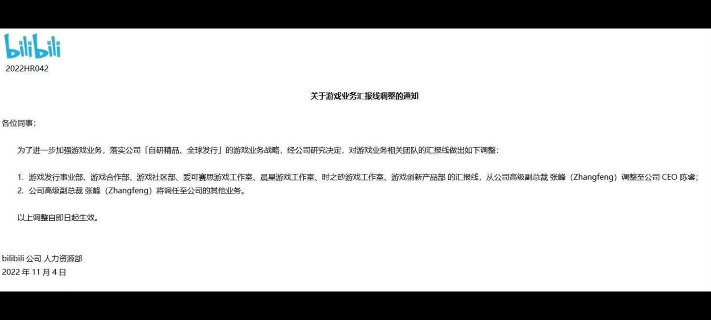5 日消息,哔哩哔哩于昨日发布内部邮件,通知了有关游戏业务汇报线的调整,CEO 陈睿亲自听取游戏业务的汇报,目的是“为了进一步加强游戏业务,落实公司「自研精品、全球发行」的游戏业务战略”。