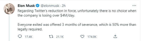 马斯克在推特中写道:“关于推特公司裁员,不幸的是,当公司每天亏损超过 400 万美元时,这别无选择。每个离开的人都得到了 3 个月的遣散费,这比法律要求的高出 50%。”
