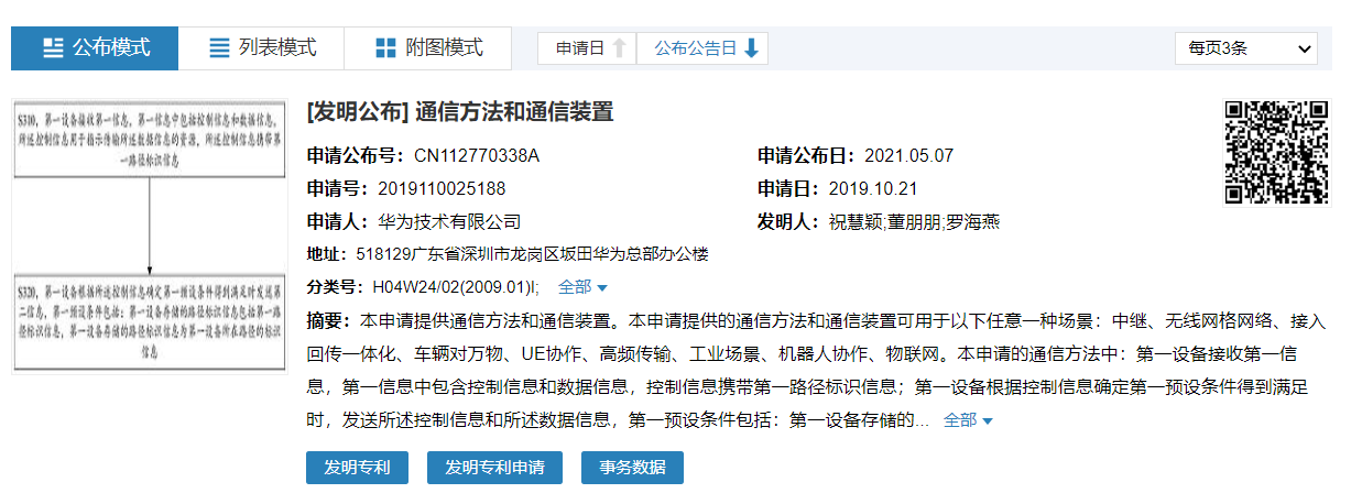 近日,华为技术有限公司申请的“通信方法和通信装置”专利已获授权。摘要显示,本申请提供通信方法和通信装置。本申请提供的通信方法和通信装置可用于以下任意一种场景:中继、无线网格网络、接入回传一体化、车辆对万物、UE 协作、高频传输、工业场景、机器人协作、物联网。本申请的通信方法中:第一设备接收第一信息,第一信息中包含控制信息和数据信息,控制信息携带第一路径标识信息;第一设备根据控制信息确定第一预设条件得到满足时,发送所述控制信息和所述数据信息,第一预设条件包括:第一设备存储的路径标识信息包括第一路径标识信息。本申请提供通信方法和通信装置,可以降低设备转发信息的时延和便于扩展网络的覆盖范围。