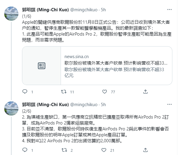 对此分析师郭明錤表示,根据其最新调查,歌尔股份暂停生产的产品是苹果的 AirPods Pro 2 耳机,暂停生产较可能是因为生产问题,而非需求问题。