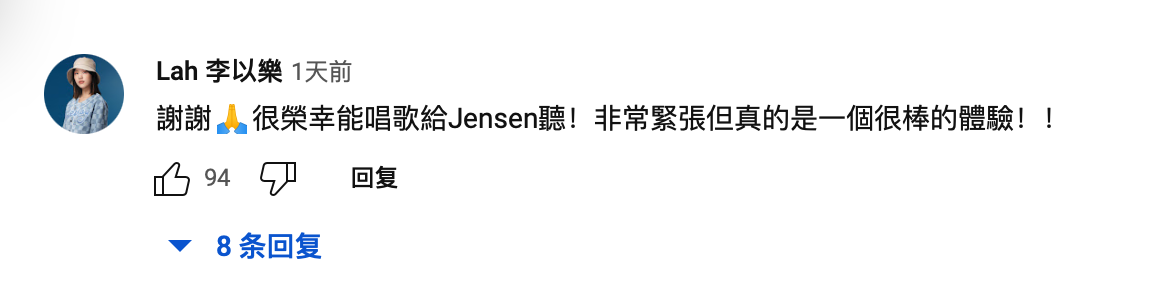 据报道,两名歌手起初没认出黄仁勋。之后,歌手李以乐在评论区表示很荣幸能唱歌给 Jensen 听。