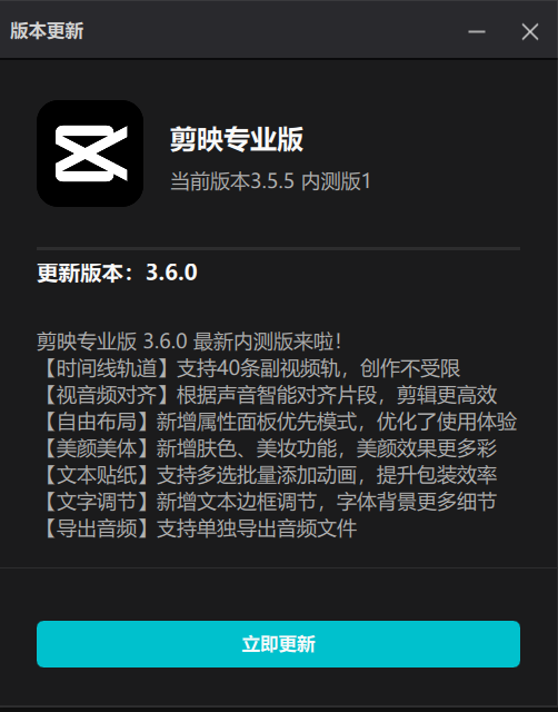 9 日消息,剪映专业版 PC 版迎来了内测版 3.6.0 更新。本次更新后,时间线轨道支持 40 条副视频轨;新增视音频对齐,根据声音智能对齐片段;自由布局新增属性面板优先模式;新增肤色、美妆功能;文本贴纸支持多选批量添加动画;新增文本边框调节;新增支持单独导出音频文件。