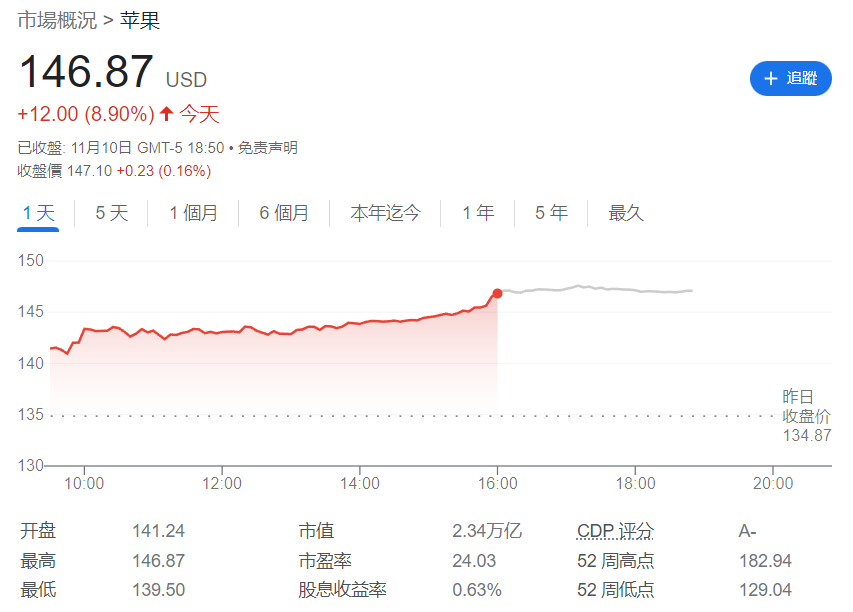 当日公布的美国 10 月通胀数据低于预期,10 月 CPI 环比上涨 0.4%,同比上涨 7.7%,提振股市。美元创 2020 年 3 月以来最大跌幅。彭博汇总的数据显示,苹果当日增幅超过亚马逊今年 2 月创下的 1908 亿美元单日市值增幅纪录。
