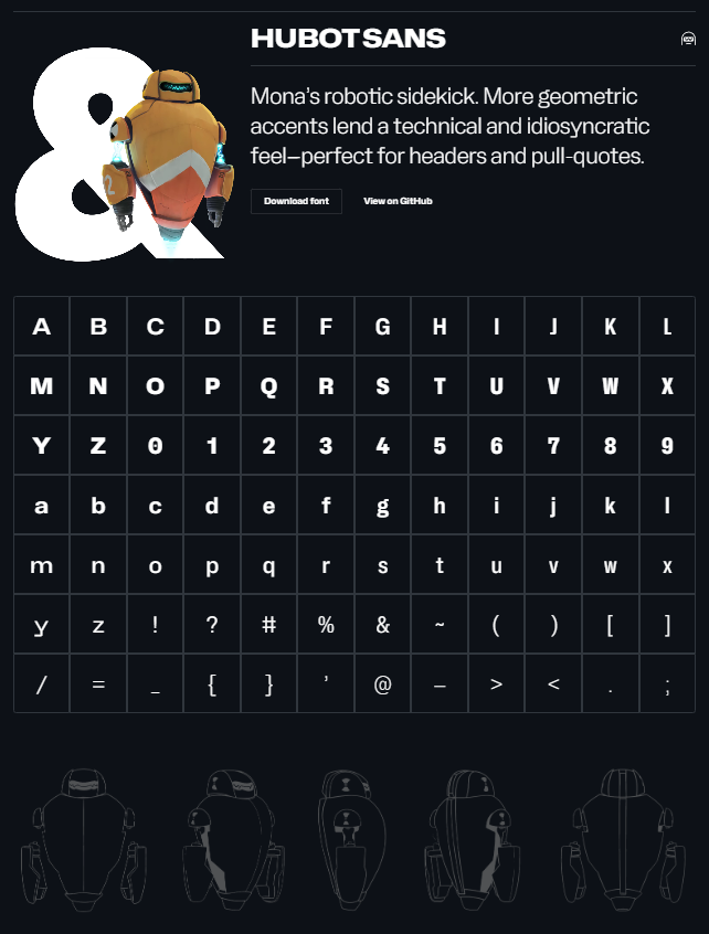 Hubot Sans 灵感来自 Mona 的机器人伙伴,更多的几何元素赋予了技术和独特的感觉,非常适合标题、引语等。