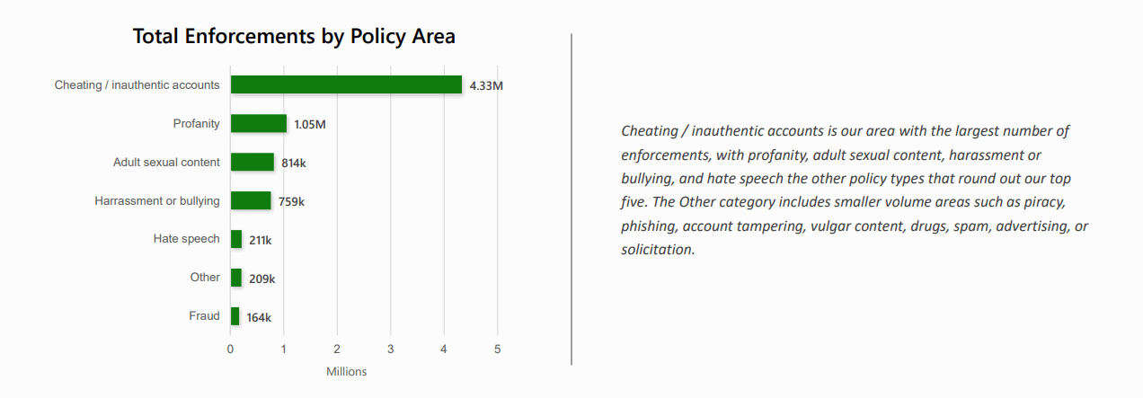 根据这份报告,Xbox 团队在他们的“主动执行”方面更加激进 —— 比之前的报告增加了 9 倍,因为有大量“不真实的账户”和“作弊账户”。